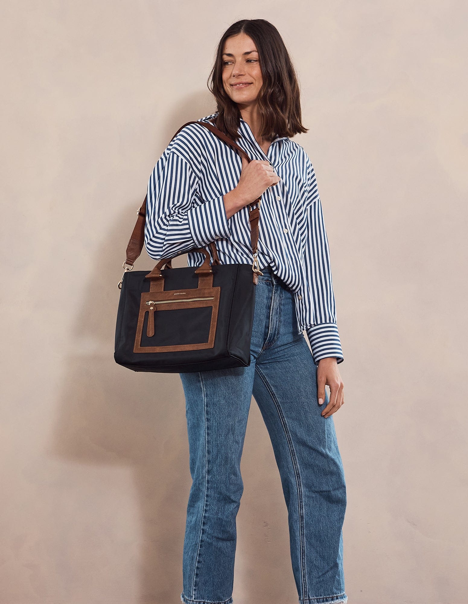 - Refined vegan leather trimming